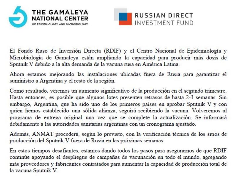 "Es posible que algunos lotes presenten retrasos de hasta 2 ó 3 semanas. Sin embargo, Argentina, que ha sido uno de los primeros países en aprobar Sputnik V y con quien hemos establecido una sólida alianza, seguirá recibiendo la vacuna", prometió el gobierno de Putin.