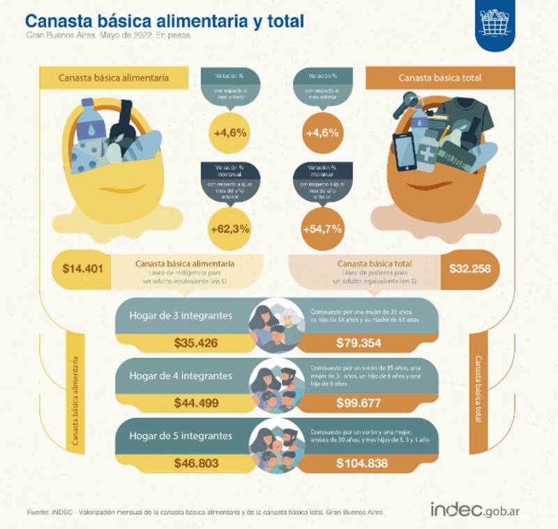 La CBA individual de mayo 2022 tuvo un aumento del 4,6% con respecto a abril y presentó una variación interanual del 62,3% en comparación al mismo mes del año anterior. Además, una familia de 4 integrantes necesitó $ 99.676,85 para superar el umbral de la pobreza, según el INDEC.