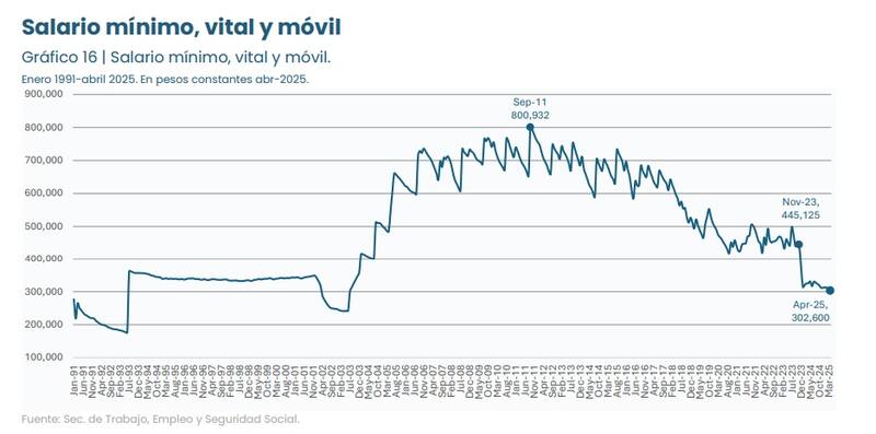 El salario mínimo, vital y móvil (SMVM) acumuló una pérdida del 32% de su poder adquisitivo entre noviembre de 2023 y abril de 2025, según un informe del Área de Empleo, Distribución e Instituciones Laborales (EDIL) de la UBA. Este deterioro lo ubicó en niveles inferiores a los de 2001, antes de la crisis de la convertibilidad, y un 62% por debajo de su pico histórico en 2011.