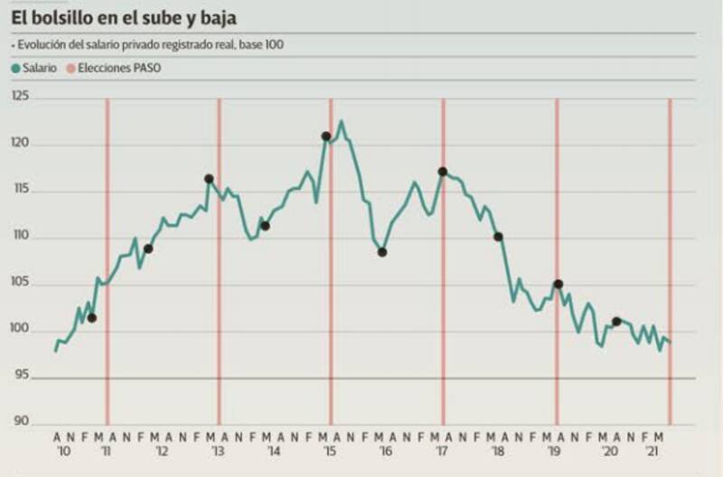 La falta de dominio de la inflación por parte del Gobierno que había puesto como meta presupuestaria para 2021 un 29%, que se alcanzó en julio, y luego la corrigió por una del 33%, que se hará efectiva en agosto, se refleja directamente en un ajuste sobre el salario. Por eso, los analistas prevén que el salario real finalice agosto y llegue a las PASO por debajo del nivel que recibió Alberto Fernández cuando asumió en diciembre de 2019.