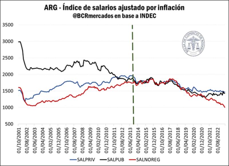 Un análisis de la evolución de los salarios desde la salida de la convertibilidadrefleja una significante caída del poder adquisitivo luego del 2001, cuando los ingresos del sector público, el privado y los no registrados se vieron perjudicados por la crisis económica.