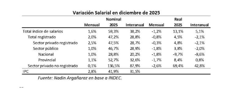 Esa medición, sin embargo, no es directamente comparable con el análisis que realiza Argañarás. Mientras el índice del INDEC captura variaciones nominales y agrega universos heterogéneos —incluido el empleo informal, con rezagos propios en su estimación—, el informe del economista se concentra exclusivamente en salarios formales, tanto del sector privado como del sector público, y evalúa su poder adquisitivo real, es decir, descontando la inflación y comparando promedios anuales y puntos de cierre.