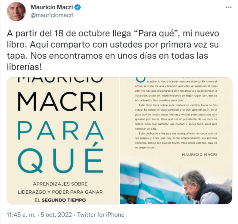 Mauricio Macri quiso evitar el 17 de octubre, Día de la Lealtad Peronista, para la salida de su libro. Como la presentación se realizará el 24 en los salones de la Sociedad Rural de Palermo, tenía que ser esta semana, para que la editorial organice la distribución en librerías. Así fue que quedó programada para un día después, el 18 de octubre y hoy llegó a las librerías.