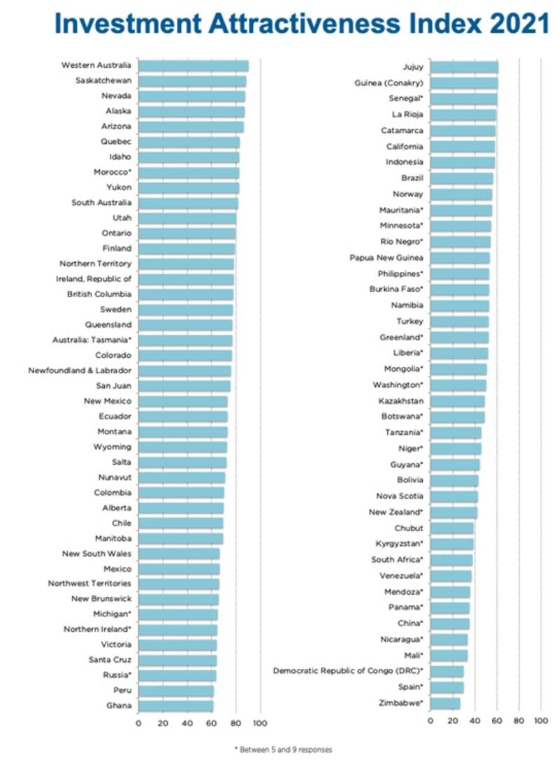 Estados Unidos fue el país con más jurisdicciones consideradas en el top ten de regiones más atractivas del mundo por invertir en minería, colocando 4 entre las principales: Nevada, Alaska, Arizona e Idaho. Canadá le siguió con tres provincias en los diez primeros puestos: Saskatchewan, Quebec y el Yukón.