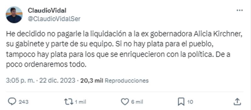 Vidal llegó el último 10 de diciembre al gobierno de la provincia patagónica en reemplazo de Kirchner, quien estuvo durante varios períodos al frente del gobierno local. Ahora, frente al panorama de ajuste a nivel nacional, publicó en sus redes sociales que no se le pagará el sueldo a la exmandataria provincial por los 9 días que ejerció la gobernación en el último mes del año.