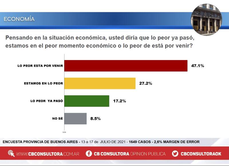 En cambio, respecto de la situación económica existe un mayor pesimismo. El 47% considera que lo peor de la crisis "está por venir", mientras que el 17% cree que "lo peor ya pasó".