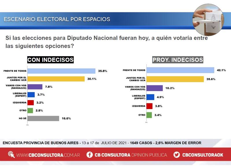 A dos días de que se definan los precandidatos a legisladores en todo el país, diversas encuestas buscan mostrar el potencial de los nombres propios y de los frentes principales. En este caso, un relevamiento de CB Consultora realizado en la provincia de Buenos Aires muestra cómo se distribuyen las preferencias actuales entre el Frente de Todos, Juntos por el Cambio y las demás alternativas.