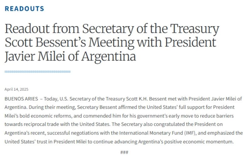 Y el texto concluye: "También felicitó al ministro por las recientes y exitosas negociaciones de Argentina con el Fondo Monetario Internacional, así como con el Banco Mundial y el Banco Interamericano de Desarrollo. El Secretario Bessent enfatizó el compromiso de la Administración Trump de consolidar su posición como el socio preferido de Argentina".