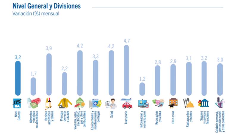 Según el informe del Instituto de Estadística y Censos porteño, el rubro que mayor aumento presentó fue "Transporte" con 4,7% seguido por "Vivienda, agua, electricidad, gas y otros combustibles" y "Salud" ambos con 4,2%; "Bebidas alcohólicas y tabaco"(3,9%); "Equipamiento y mantenimiento del hogar" (3,3%); y "Seguros y servicios financieros" (3,2%).