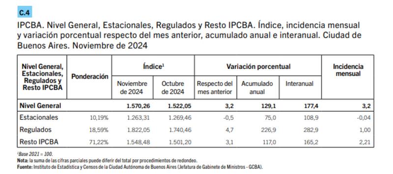 La inflación porteña en la Ciudad Autónoma de Buenos Aires (CABA) fue del 3,2% noviembre, misma cifra que marcó en octubre, lo que implicó una variación interanual del 177,4% y un acumulado para los primeros 11 meses del año del 129,1%.