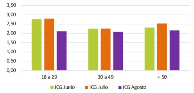 Sin embargo, se hace notoria la caída que se produjo, en el último mes, entre los más jóvenes, históricos integrantes del núcleo duro libertario: solían tener el ICG más alto en meses anteriores y ahora un fuerte descenso del 24,4%.