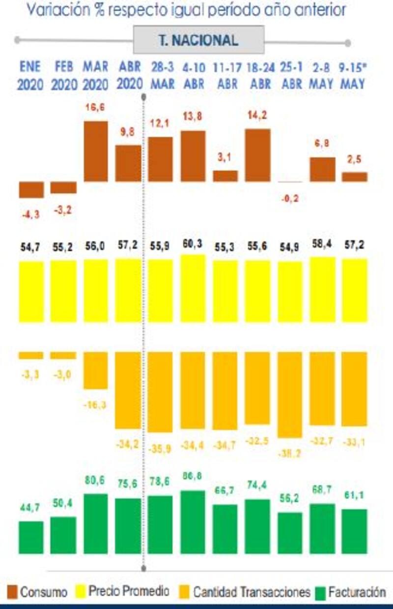 Un relevamiento sobre el comportamiento del consumo expone que la segunda semana de mayo se ubica entre las de menor nivel de facturación desde que comenzó la cuarentena por la pandemia de coronavirus, al tiempo que es la que muestra mayor cantidad de transacciones.