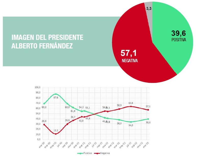 La encuesta se detiene también sobre la imagen de Alberto Fernández. Si bien continúa en negativo, mejoró respecto a la última medición. El 57% tiene una imagen negativa del presidente, mientras que para el 40% es positiva. En el peor momento, había casi 30 puntos de distancia entre ambos valores. En cambio, en la época de mayor aprobación, al comienzo de la pandemia, Fernández había llegado al 87% de imagen positiva y solo 11% negativa.