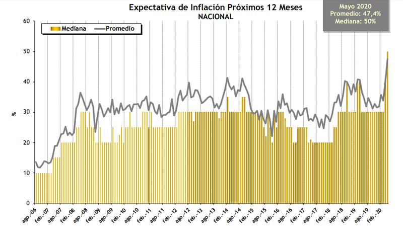 En medio de la cuarentena, la inflación esperada para los próximos 12 meses se disparó a un máximo histórico al tocar 50% en mayo, 10 puntos porcentuales más que la que se estimaba en abril (40%) y 20 pp desde la medición de dos meses atrás.