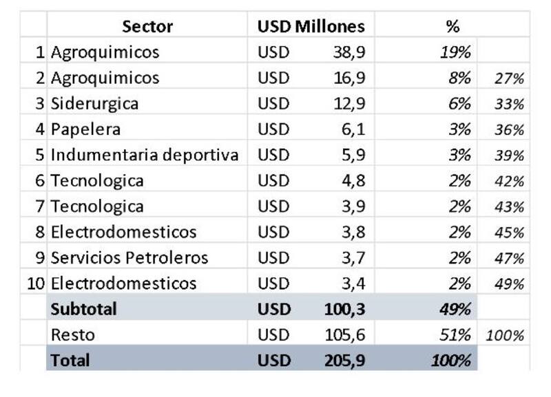 "Las dos principales firmas pertenecen al sector agroquímicos y concentran el 27% del total de las operaciones", aseguró el organismo y aclaró que en ningún caso se aportó valor agregado en Uruguay: "Todas fueron casos de refacturación".