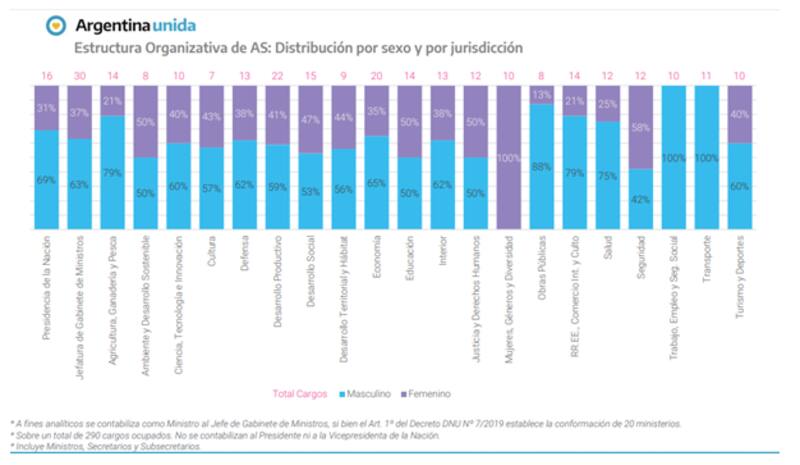 "El 37% de los puestos más altos de la estructura organizativa del total de los cargos jerárquicos, que incluyen ministerios, secretarías y subsecretarías, están ocupados por mujeres", fue el resultado al que se llegó luego de un relevamiento promovido por el jefe de Gabinete, Santiago Cafiero, y realizado por la Dirección Nacional de Diseño Organizacional de esa cartera,