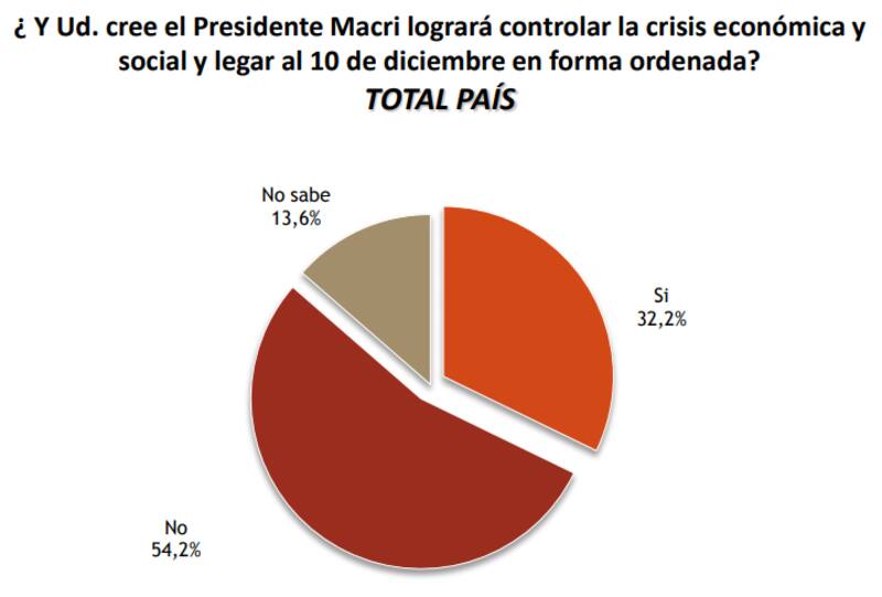 En tanto, la expectativa de la evolución de la situación económica de cara al 10 de diciembre es altamente negativa. Es que el 54% cree que Macri no logrará controlar la crisis económica y social para terminar su mandato en forma ordenada.