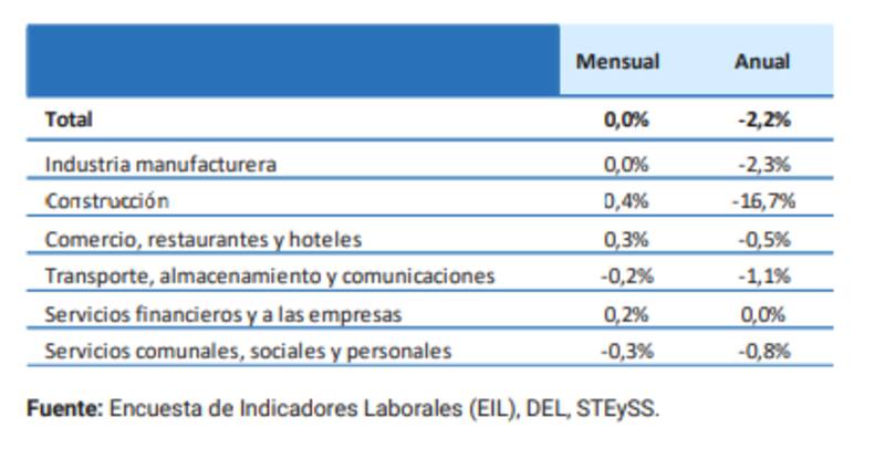 Los dos sectores que empujaron el freno de la caída fueron la construcción, que por primera vez en once meses registró un aumento de la dotación del 0,4%, y la industria manufacturera que se mantuvo sin cambios por primera vez en ocho meses.