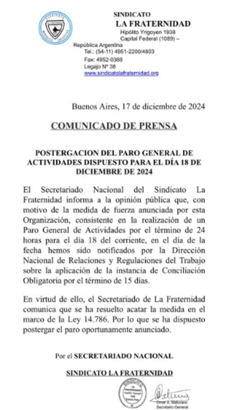 "En el día de la fecha hemos sido notificados por la Dirección Nacional de Relaciones y Regulaciones del Trabajo sobre la aplicación de la instancia de Conciliación Obligatoria por 15 días", informó La Fraternidad a través de un comunicado.