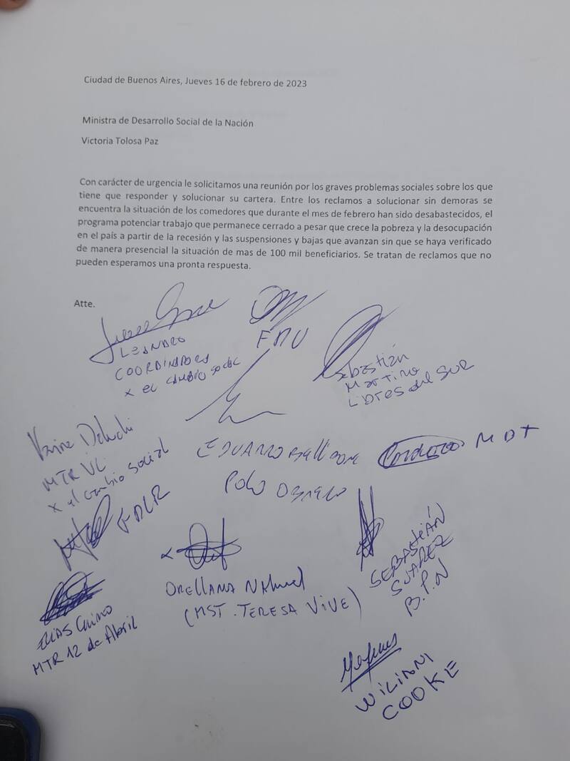 Además, reiteró el pedido al referente de la Unidad Piquetera, Eduardo Belliiboni, de que "traiga a las puertas del Ministerio a los más de 12 mil titulares de la Unidad Piquetera" para realizar la validación de identidad obligatoria para continuar siendo beneficiarios del programa.