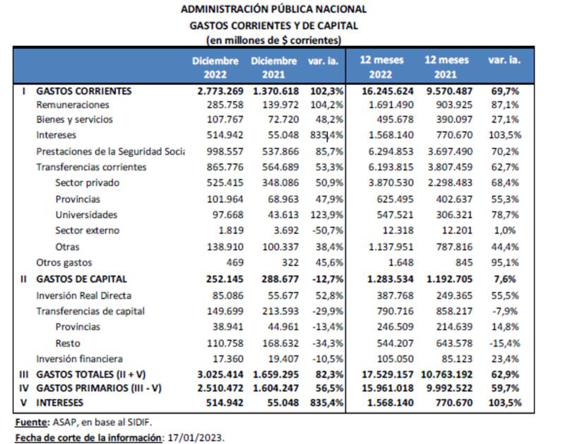 La composición del ajuste en el gasto fue dispersa: mientras las erogaciones corrientes tuvieron una retracción del 1,6% real (crecimiento nominal de 69,7% contra una inflación promedio anual de 72,4%), los gastos de capital se desplomaron en un 37,6% real -salto nominal de apenas el 7,6%-. En tanto, los intereses de la deuda pública crecieron hasta casi $ 1,6 billones, un 18% real -103,5% nominal- frente al 2021, por lo que el gasto total bajó un 5,5% real.