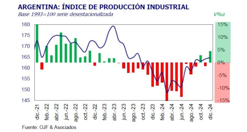 Así lo reflejó el Índice Producción Industrial (IPI-OJF), confeccionado por Orlando J. Ferreres & Asociados, que reveló que, en el último mes de 2024, la producción industrial creció 4,5% interanual y, en la medición desestacionalizada, registró una expansión mensual de 0,4%.