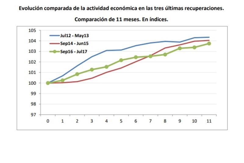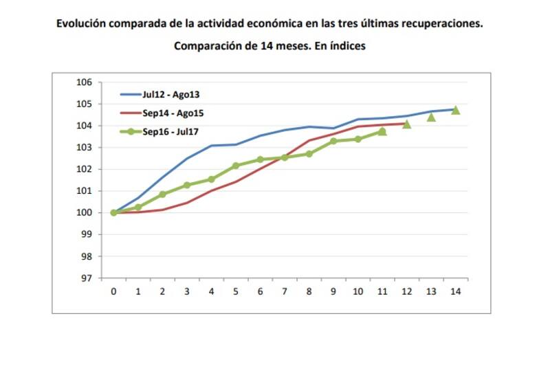 Así, el informe relativizó el hecho de que el promedio de crecimiento durante la primera recuperación ocurrida entre julio de 2012 y mayo de 2013 haya sido el más alto de las tres analizadas (4,34 por ciento) al destacar que la reactivación se suavizó tras los primeros cinco meses de expansión.