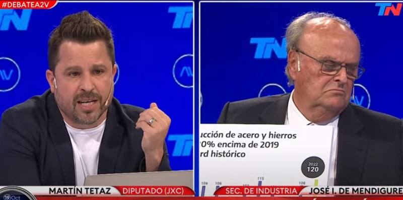 Invitados a debatir economía en el estudio de TN, la diplomacia y los gestos amistosos duraron un suspiro y enseguida comenzó la discusión más enfática. Fue de entrada, cuando Tetaz le recordó a De Mendiguren su participación, como ministro de la Producción, en el gobierno de Eduardo Duhalde, que arrancó en 2002.