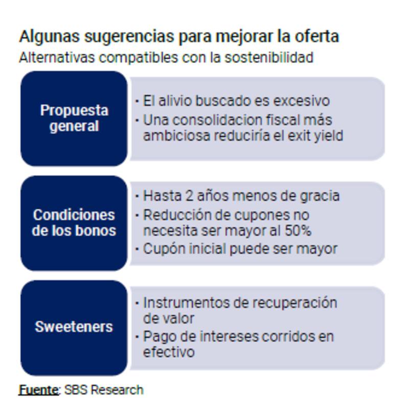 Otra manera de mejorar la oferta es modificando el devengamiento de los intereses, los cuales se postergan por los primeros tres años. Analistas ven poco probable que los acreedores acepten no cobrar ningún cupón de intereses dentro de los próximos tres años, por lo que en ese punto existe espacio para que la oferta se mejore.