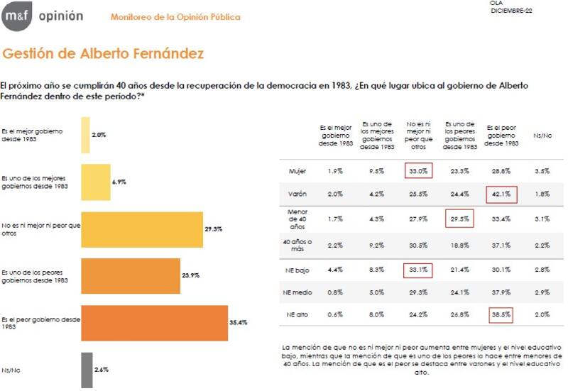 En cambio, para el 35% es el peor gobierno desde 1983. Y otro 24% lo encuadra entre los peores. Los varones y las personas con nivel socioeconómico alto lo califican peor que la media. En cambio, las personas de nivel socioeconómico bajo y los mayores de 40 años lo ponderan algo mejor.