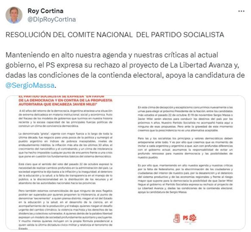 "Y frente al riesgo mayor que supone para la democracia la posibilidad de que Javier Milei llegue al gobierno, el Partido Socialista expresa su rechazo al proyecto de La Libertad Avanza y, dadas las condiciones de la contienda electoral, apoya la candidatura de Sergio Massa", concluyó.