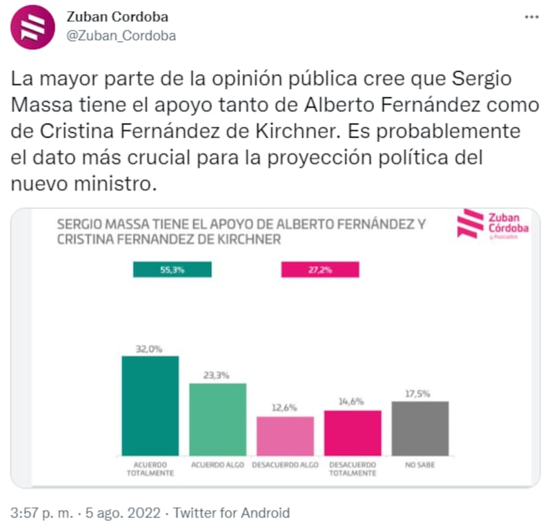 Por último, la encuesta relevó que opina la sociedad sobre el apoyo que logró el nuevo ministro entre el resto de los integrantes del Frente de Todos: el Presidente y la vice Presidenta.