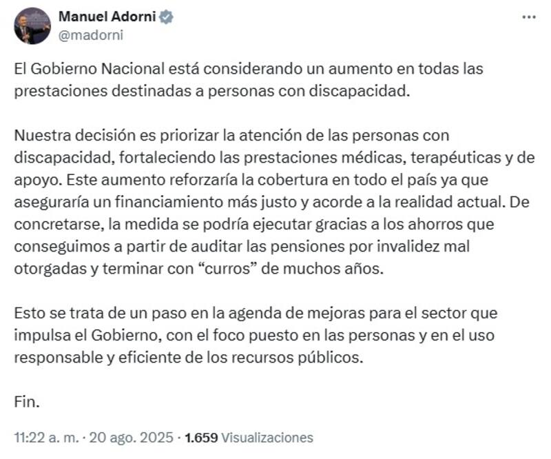 El Gobierno de Javier Milei está considerando dar un aumento a todas las prestaciones destinadas a personas con discapacidad. Así lo anticipó el vocero presidencial Manuel Adorni.