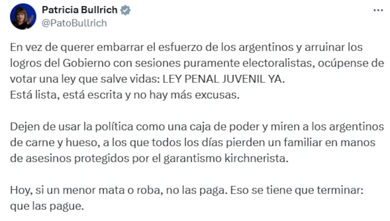 En esa línea agregó: "Está lista, está escrita y no hay más excusas. Dejen de usar la política como una caja de poder y miren a los argentinos de carne y hueso, a los que todos los días pierden un familiar en manos de asesinos protegidos por el garantismo kirchnerista".