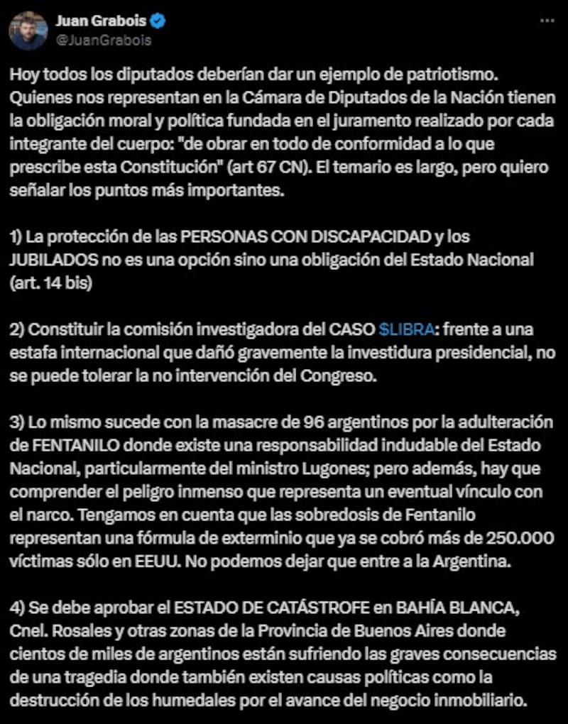 "Todos los diputados deberían defender la patria, especialmente los diputados del Movimiento Nacional y Popular, incluyendo los de las provincias no alineadas con Fuerza Patria que deberán priorizar los intereses conjuntos a pequeñas concesiones parciales", señaló a través de un mensaje de X.
