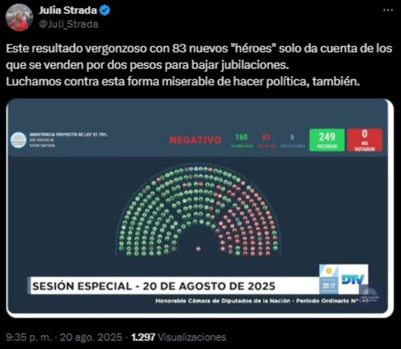 "Este resultado vergonzoso con 83 nuevos ´héroes´ solo da cuenta de los que se venden por dos pesos para bajar jubilaciones. Luchamos contra esta forma miserable de hacer política, también", escribió en su cuenta de red social X.