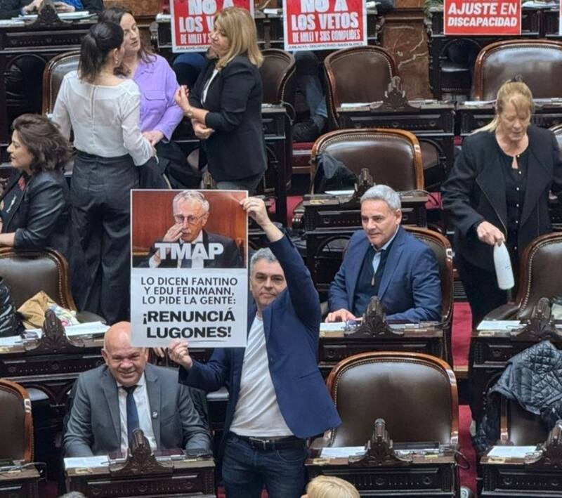 El legislador socialista Esteban Paulón llegó al recinto con un cartel con la foto de Lugones y reclamando su renuncia, en medio de las críticas al ministro.