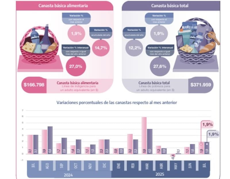 Por lo tanto, quienes tengan un ingreso familiar por encima de ese valor, se podría considerar que están en la clase media. Durante julio de 2025, la variación mensual de la canasta básica alimentaria (CBA) y de la canasta básica total (CBT) fue de 1,9%. La CBA y la CBT acumulan en el año incrementos de 14,7% y 12,2%, respectivamente.