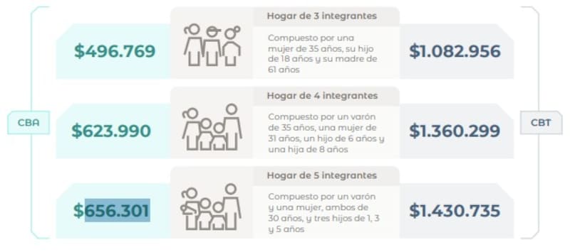 Así, una familia tipo, compuesta por un varón de 35 años, una mujer de 31 años, un hijo de 6 años y una hija de 8 años, necesitó $ 1.360.269 para no ser pobre. Ese mismo hogar, formado por dos adultos y dos menores, requirió $ 623.990 para cubrir sus necesidades básicas de alimentación y no caer en situación de indigencia.