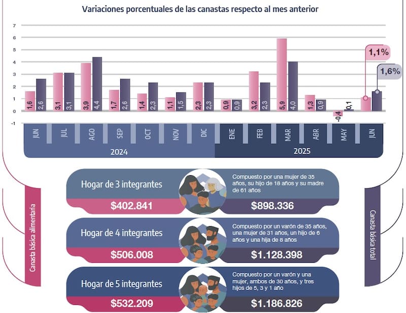 Durante junio de 2025, las canastas básicas registraron los siguientes incrementos: