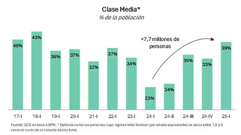 "La clase media, definida arbitrariamente como las personas con ingreso total familiar entre 1,5 y 4 veces el costo de la canasta básica total, está integrada por el 39% de la población. Sumó 7,7 millones de personas en el último año", resalta el reporte que enfatiza la baja de la inflación como decisiva en la mejora del indicador.