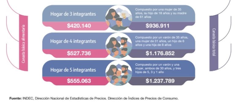 Así, una familia tipo, compuesta por un varón de 35 años, una mujer de 31 años, un hijo de 6 años y una hija de 8 años, necesitó $ 1.176.852 para no ser pobre. Ese mismo hogar, formado por dos adultos y dos menores, requirió $ 527.736 para cubrir sus necesidades básicas de alimentación y no caer en situación de indigencia.