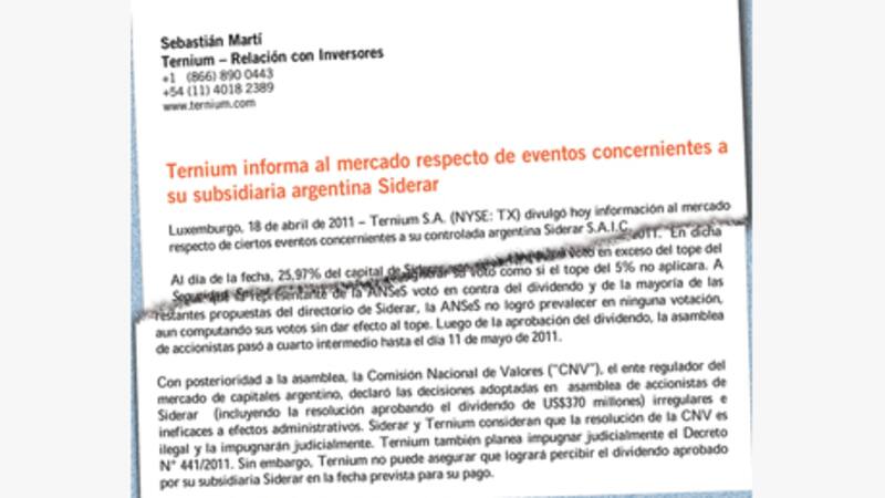 Las dudas respecto del pago de utilidades también fue planteado por Ternium, el accionista mayorista, al mercado internacional. Según un comunicado de la controlante dado a conocer ayer en Luxemburgo, a raíz de la resolución de la CNV, considerada ilegal, Ternium no puede asegurar que logrará percibir el dividendo aprobado por su subsidiaria Siderar en la fecha prevista para su pago.