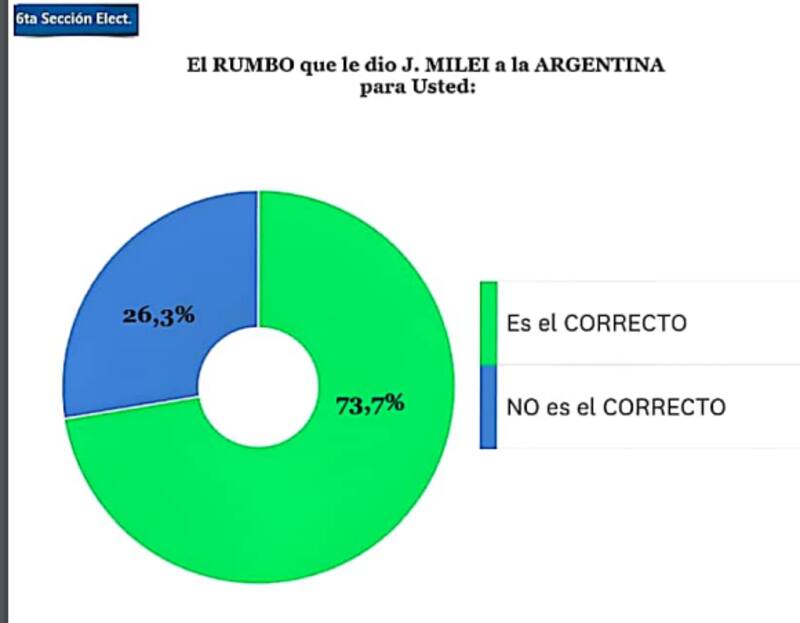 En paralelo, la evaluación del rumbo nacional bajo el liderazgo de Milei ofreció una visión más positiva. Según el sondeo, el 73,7% de los encuestados consideró que el camino adoptado por el Presidente es "el correcto", mientras que solo un 26,3% opinó lo contrario.