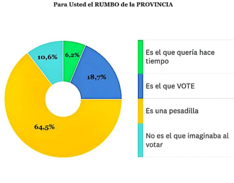 Cuando se preguntó si el rumbo bonaerense "es correcto o no es el correcto", el 75,9% consideró que no lo era, frente a un 24,1% que opinó lo contrario. Esta percepción negativa se profundizó al indagar sobre la experiencia de los ciudadanos respecto al camino emprendido por la provincia. A la consulta: "¿Para usted, el rumbo de la provincia es?", las respuestas reflejaron un alto nivel de descontento. El 64,5% lo calificó como "una pesadilla", un 18,7% aseguró que "es el que voté", un 10,6% afirmó que "no es el que imaginaba al votar" y apenas un 6,2% lo describió como "el que quería hace tiempo".