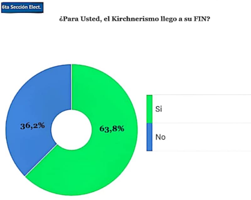 Otro aspecto relevante del relevamiento fue la percepción sobre el futuro del kirchnerismo. A la pregunta "¿El kirchnerismo llegó a su fin?", el 63,8% de los participantes respondió que sí, frente a un 36,2% que lo negó.