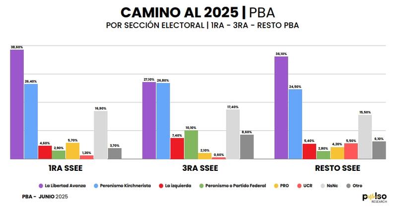 El escenario se vuelve más ajustado al observar los datos por sección electoral. En la Tercera Sección -históricamente dominada por el peronismo y donde Cristina Fernández de Kirchner iba a ser candidata antes de su encarcelamiento- la diferencia entre los principales espacios se reduce sensiblemente, y se observa una virtual paridad entre La Libertad Avanza y el kirchnerismo. En la Primera Sección y en el resto del territorio bonaerense, la ventaja libertaria es más clara.