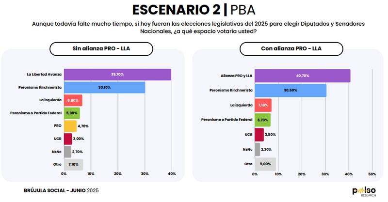En un segundo escenario electoral hipotético, donde La Libertad Avanza conformara una alianza con el PRO, la nueva coalición alcanzaría un 40,7% de intención de voto, ampliando aún más la diferencia frente al kirchnerismo.