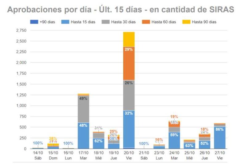 El riesgo que advierten los analistas es el de la política ya que, justamente, el viernes 20 de octubre -previo a las elecciones- las aprobaciones picaron en punta. "Se han aprobado SIRAs muy rápidamente, algo no habitual", explicó Eduardo Rotbard, CEO de Ia firma que procesa el 25 % de los datos del mercado (5.300 CUITs), y señaló que valores que estaban en 30% hace dos semanas crecieron al 50% en octubre.