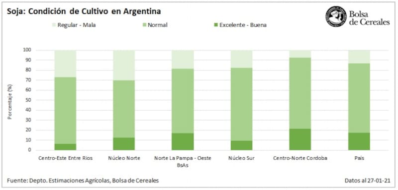 Los proyecciones están incluidas en el Panorama Agrícola Semanal (PAS) que difunde la Bolsa de Cereales porteña, que destaca como las zonas más comprometidas en la producción sojera el área centro-este de Entre Ríos, el norte de la zona núcleo y el centro-norte de Córdoba, afectadas por la falta de lluvias, "informan abortos de flores producto del estrés térmico y prevén mermas en los rindes", sostiene el informe.